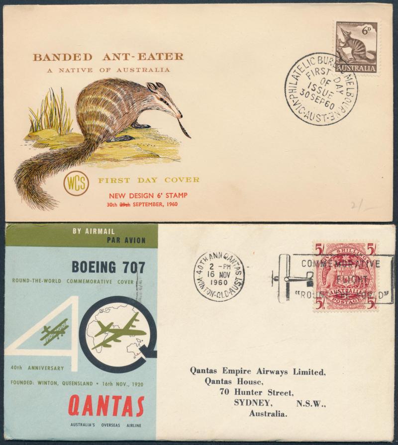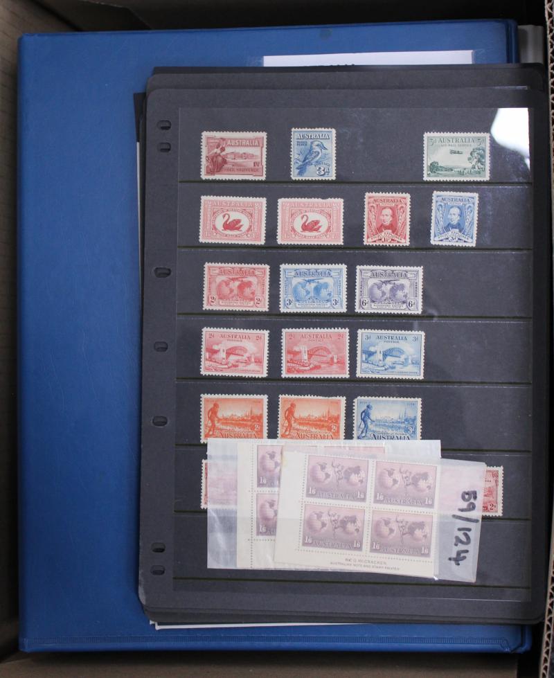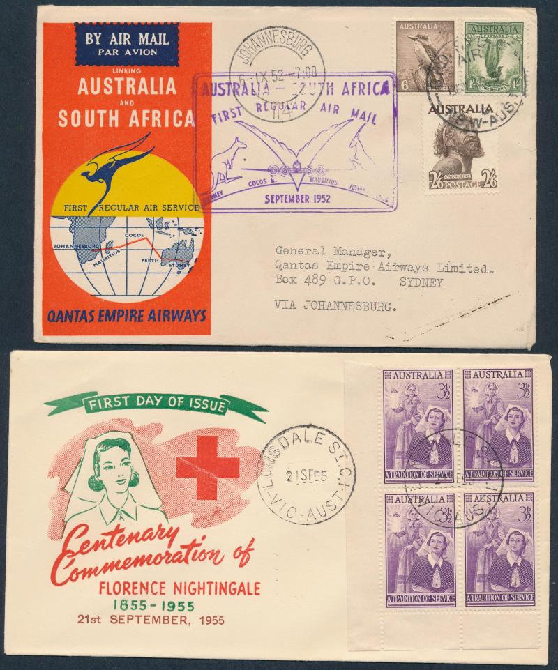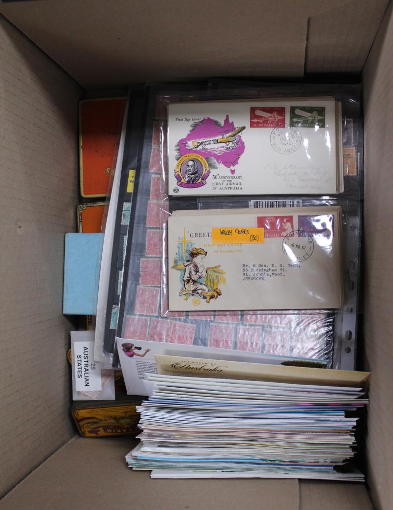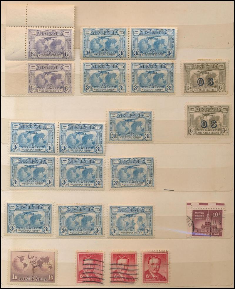 blocks noted 3d Kookaburra block of 39 (10x4; one missing), Decimals with a little postage and plenty of FDCs, PSEs, commemorative cancels, a few Flight covers, etc, also a little worldwide with pickings including Tonga & Fiji covers, Indonesia 1950