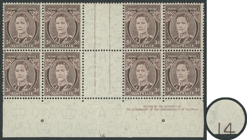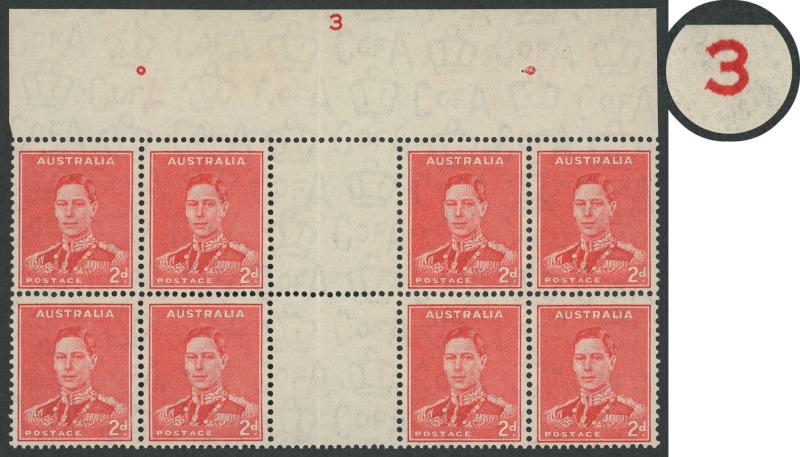 1937-49 Definitives Perf 15x14 KGVI 2d red Die II SG 184 gutter block of 8 (4x2) with complete Plate Number ' 3 ' at Top ACSC