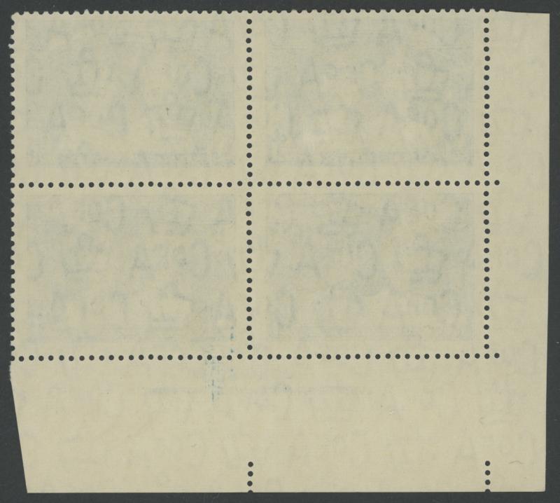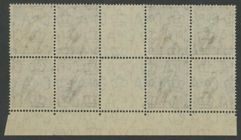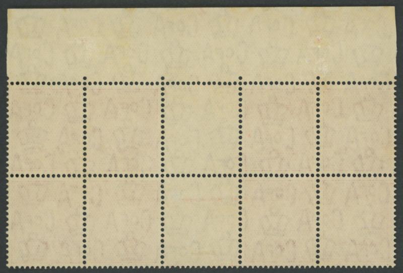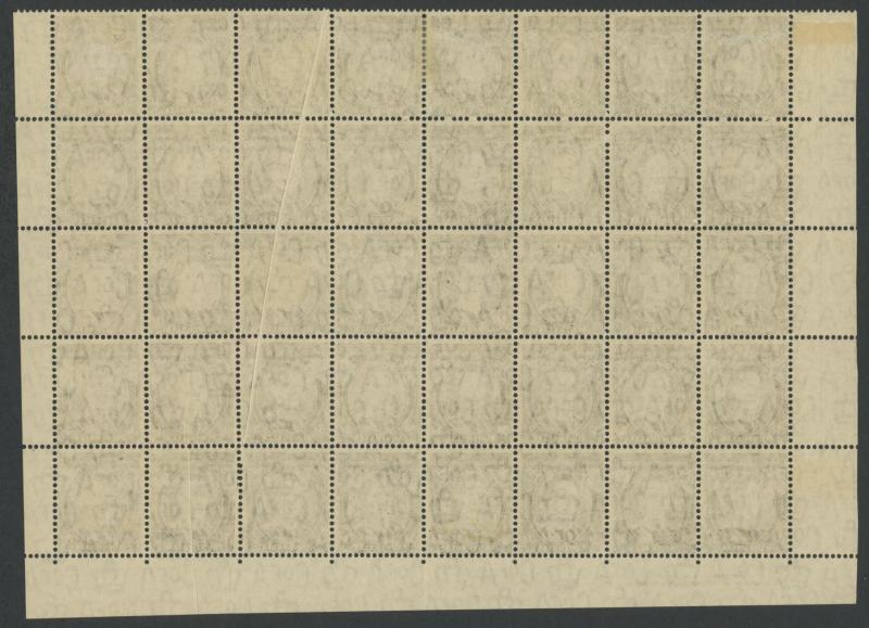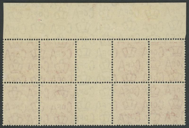 right-hand side of Sheet A ACSC 208ba, gum bend, mounted in margin only, Cat $950. Caused by a failed experiment whereby a perforation alignment device was attached to the plate. Not surprisingly the constant pressure from the printing press caused
