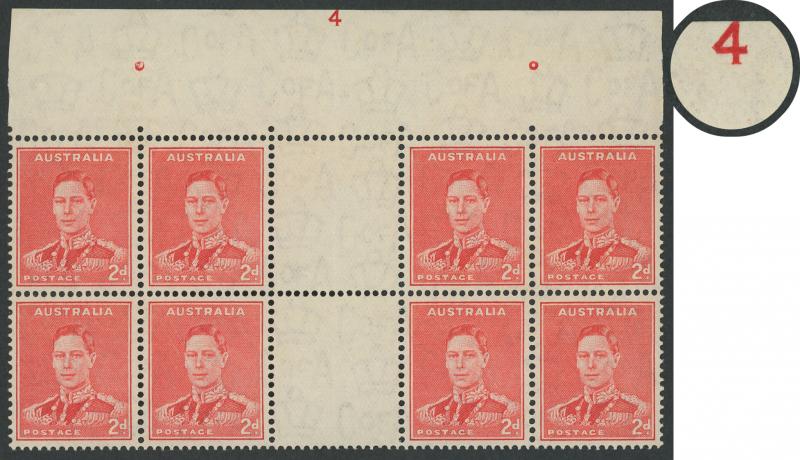 1937-49 Definitives Perf 15x14 KGVI 2d red Die II SG 184 gutter block of 8 (4x2) with complete Plate Number ' 4 ' at Top ACSC