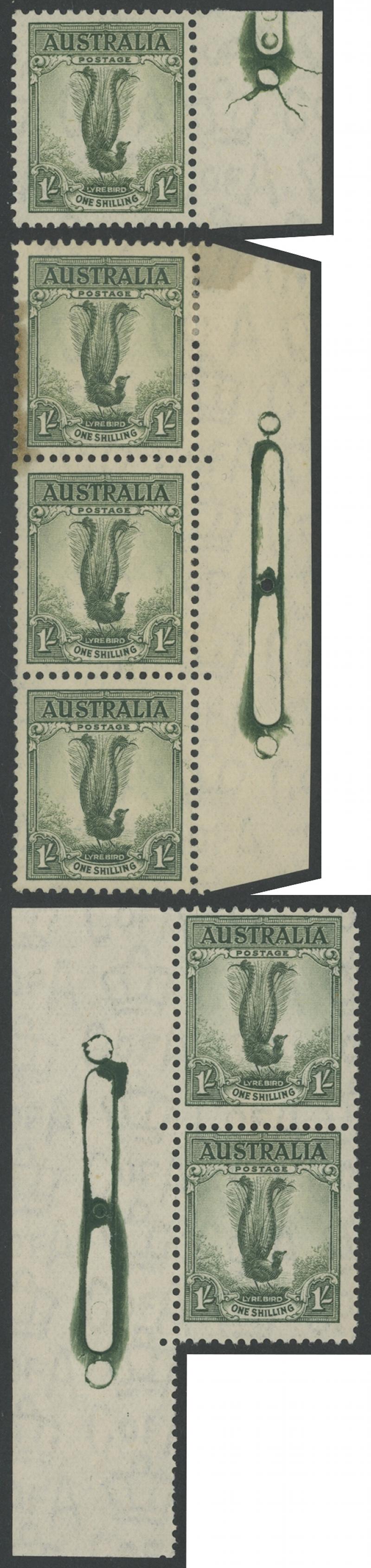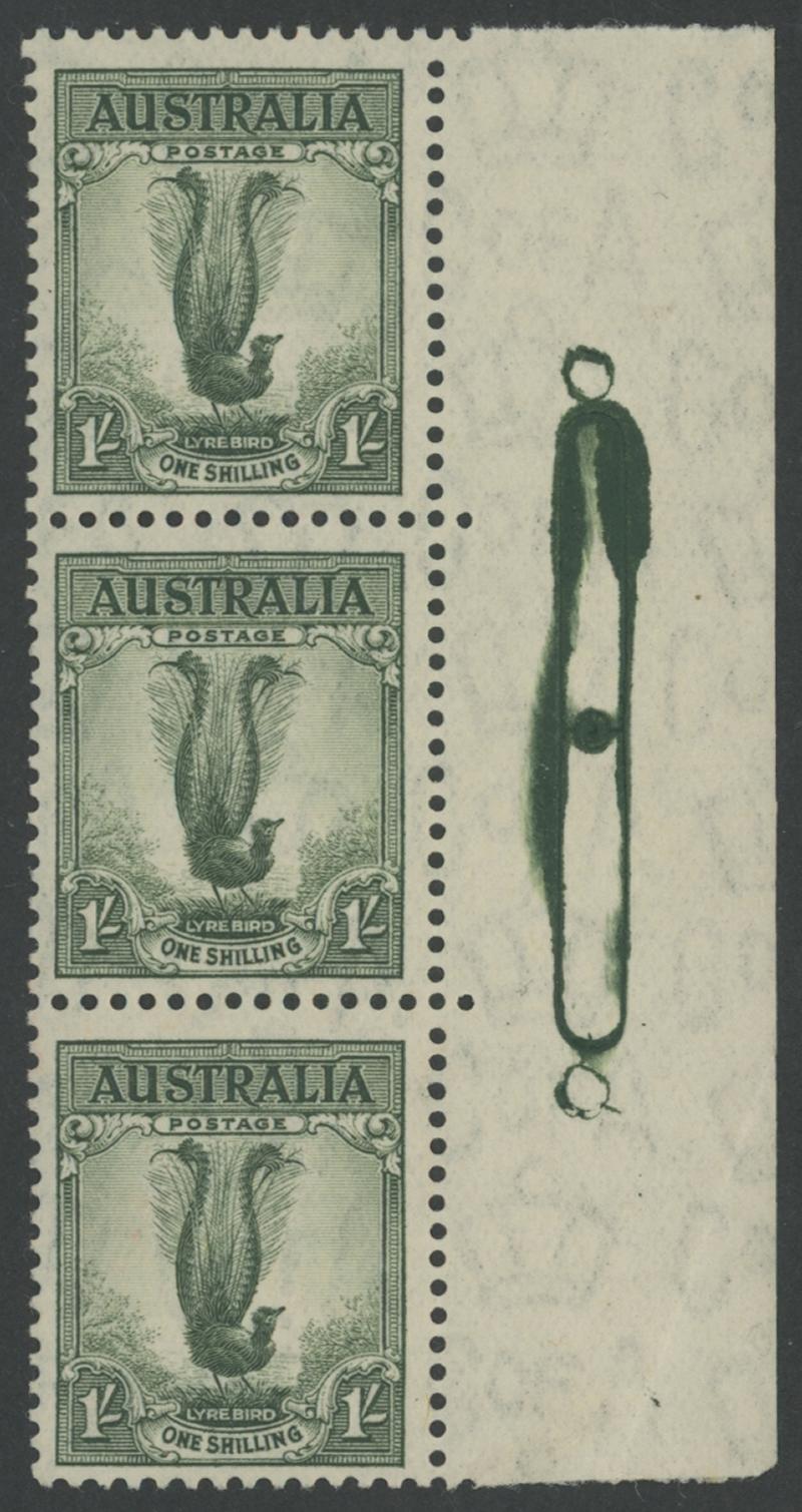 1938-49 Definitives Perf 13½x14 1/- Lyrebird SG 174 vertical strip of 3 with complete Deteriorated Perf Guide Mark from the