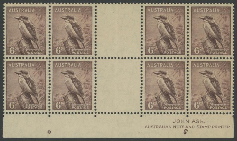 1937-49 Definitives Perf 13½x14 6d Kookaburra SG 172 Ash Imprint gutter block of 8 with Crescent over Perf Pip ACSC 202bb, Cat