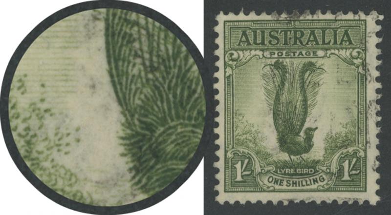 1937-49 Definitives Perf 15x14 1/- Lyrebird SG 192 Retouched Shading Lines to Left of Bird ACSC 209L (position not recorded), Cat