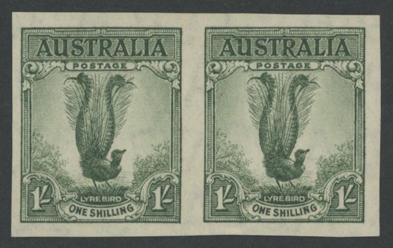 1937-49 Definitives Perf 15x14 Lyrebird 1/- green SG 192 horizontal Imperforate Pair ACSC 209b, good even margins, Cat $800. (Image1) (Image2)