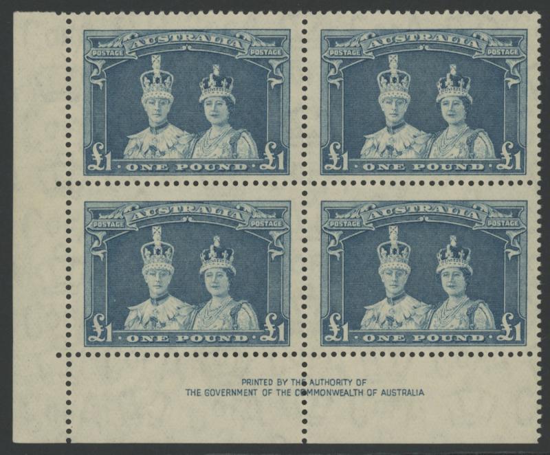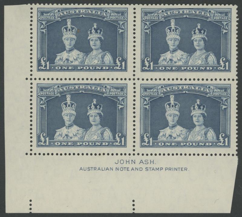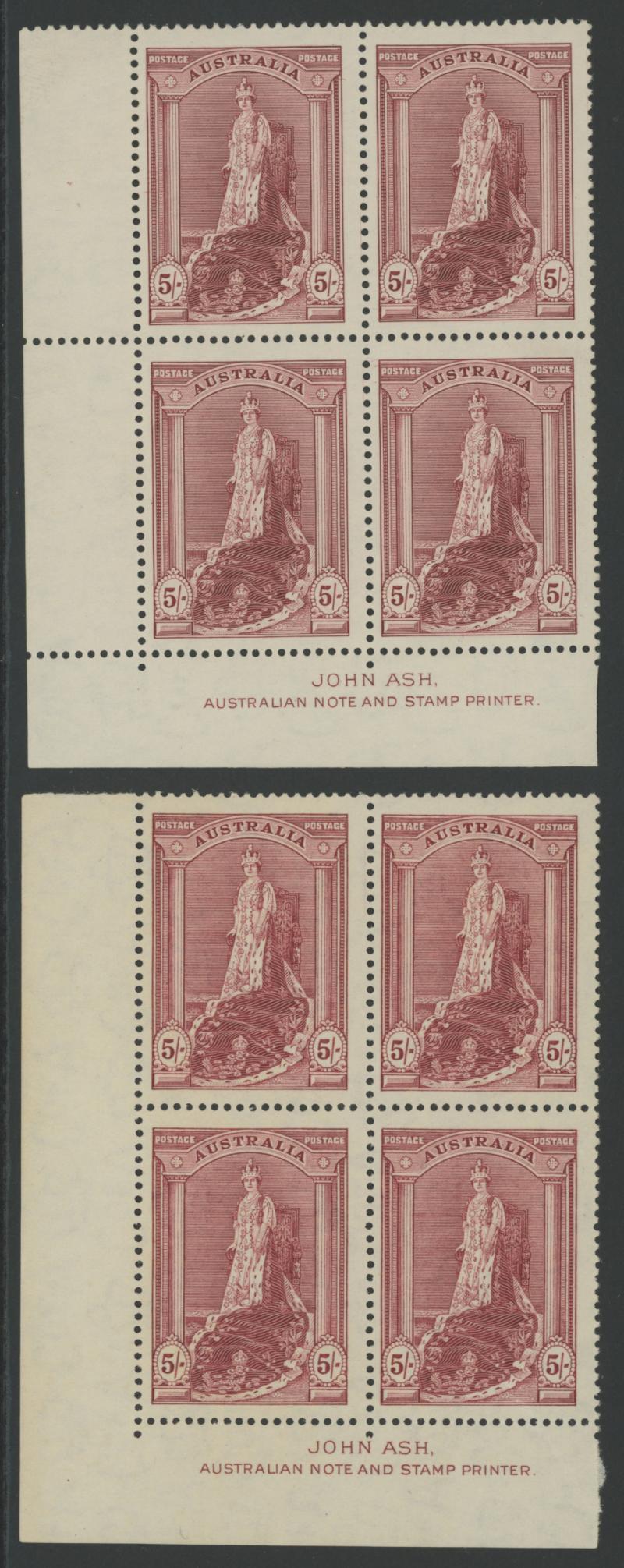 1937-49 Robes imprint blocks of 4 comprising Thick Paper 5/- John Ash x2 and £1 John Ash and Thin Paper £1 Authority, all