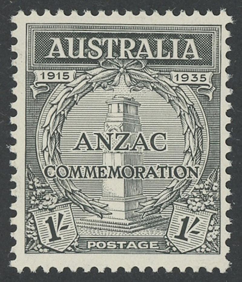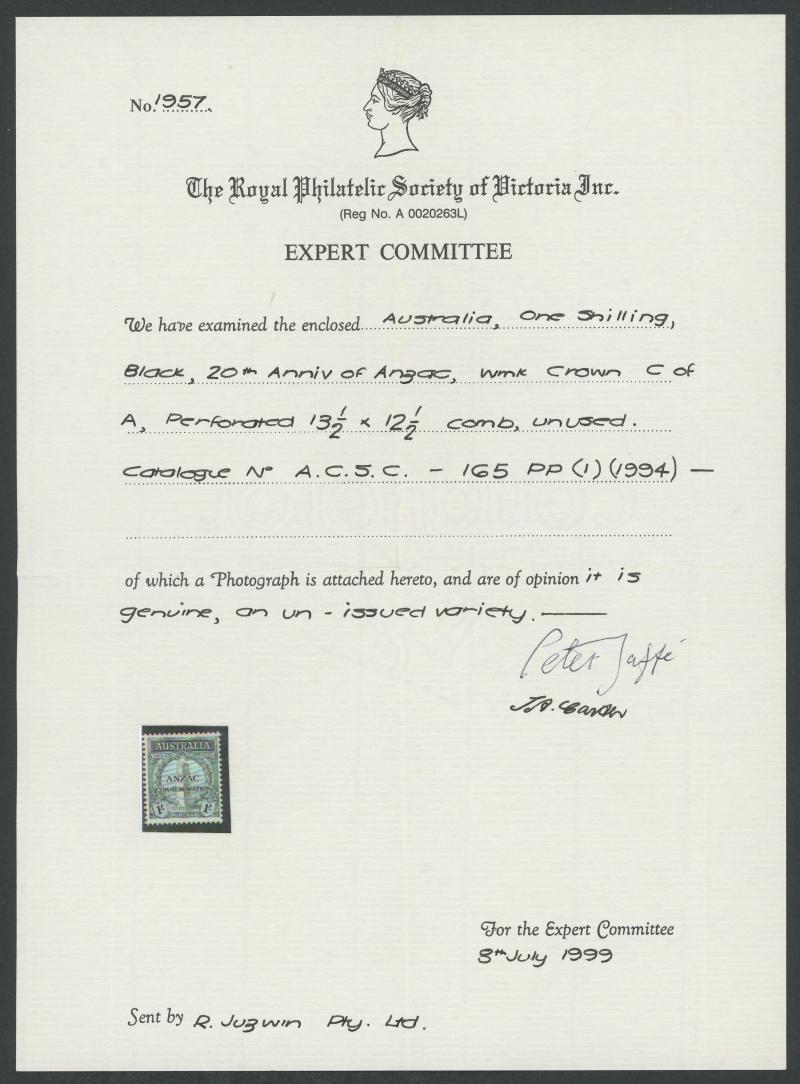 1935 ANZAC 1/- black Perf 13½x12½ on Thinner Paper ACSC 165PP(1), unmounted, Cat $2750 (£1600 for mounted; see the footnote below