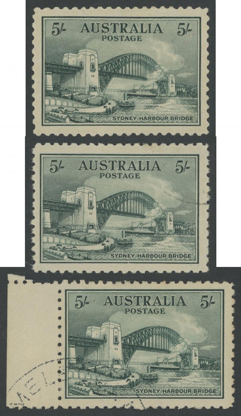 1932 Sydney Harbour Bridge 5/- green ACSC 148 (SG 143), well-centred, unmounted, a CTO example and another marginal example with