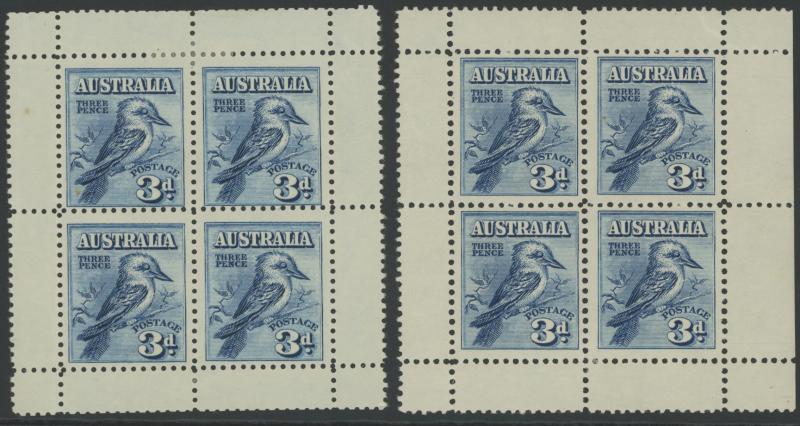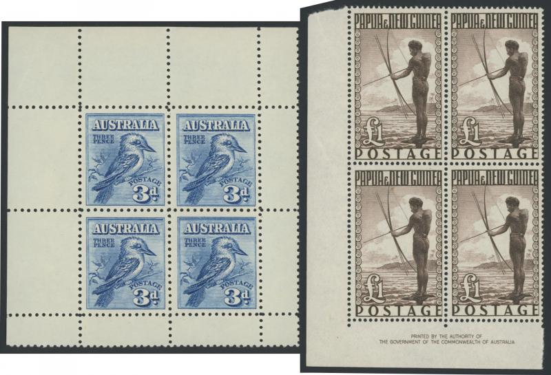 3d Kookaburra minisheet from upper-left of sheet ACSC 133MS (SG 106a) plus Papua New Guinea 1952 £1 Fisherman Authority Imprint