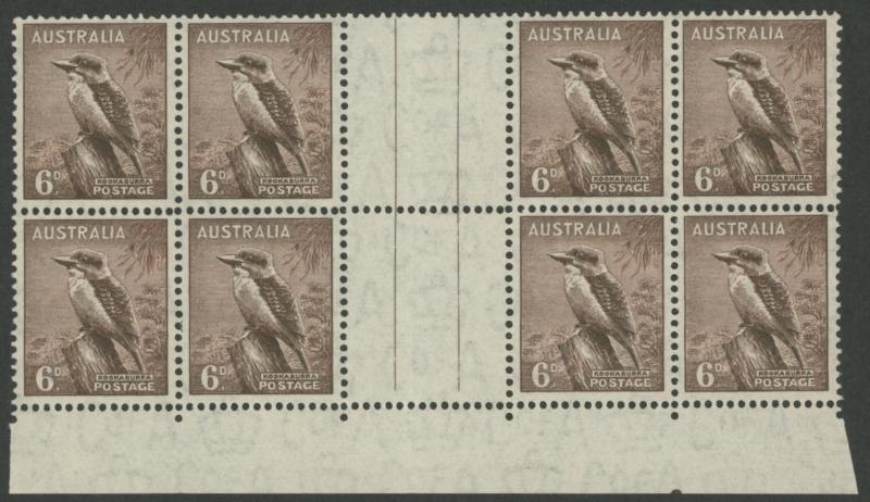 1937-49 Definitives Perf 15x14 6d Kookaburra SG 190 No Imprint gutter block of 8 ACSC 203zo, unmounted, Cat $275. (Image1) (Image2)