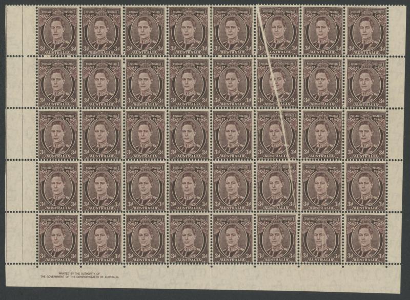 1937-49 Definitives Perf 15x14 3d brown KGVI ACSC 196 (SG 187) block of 40 (5x8) from the lower part of the right-hand pane with