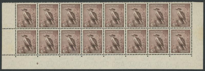 1938-49 Definitives Perf 13½x14 6d Kookaburra SG 172 No Imprint block of 16 with perf pip (2x8) ACSC 202ba and zb, mounted in a