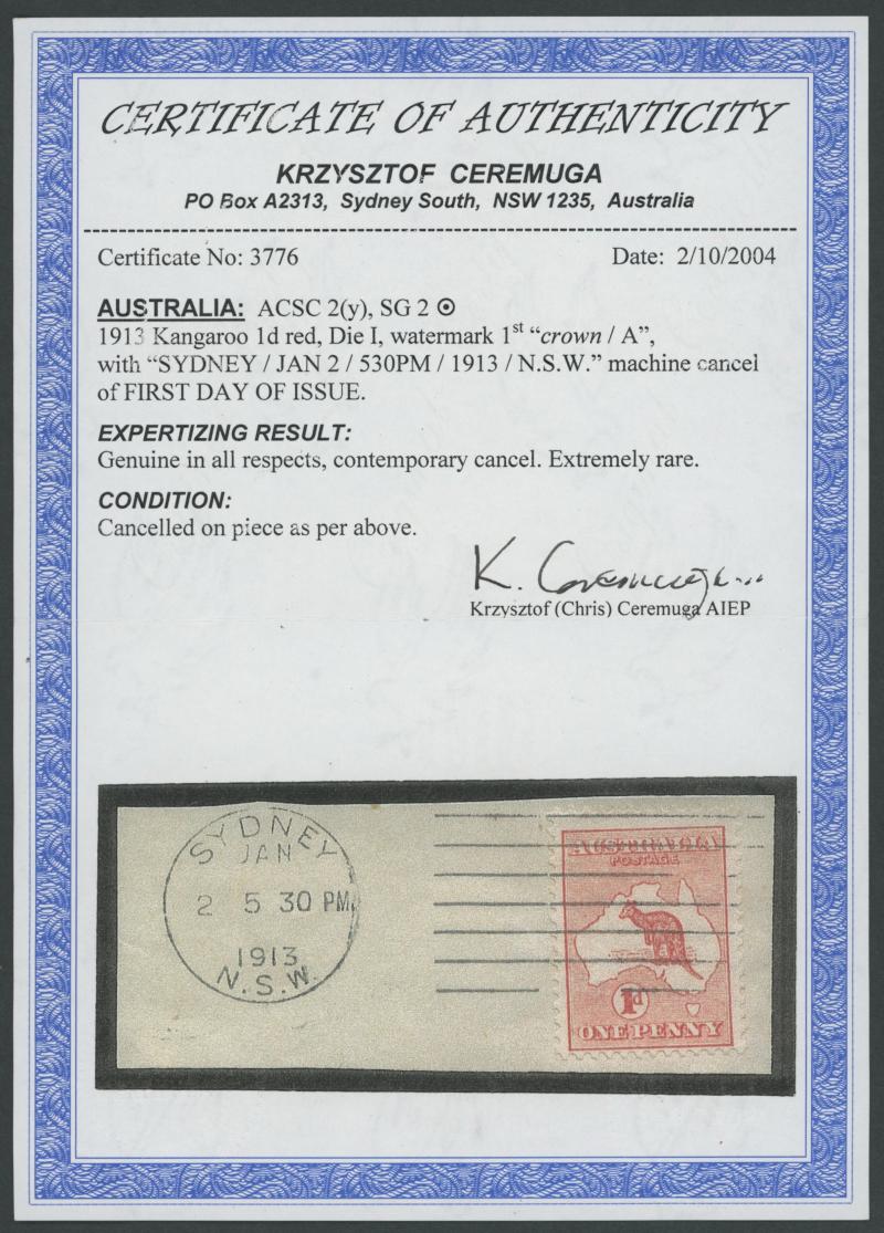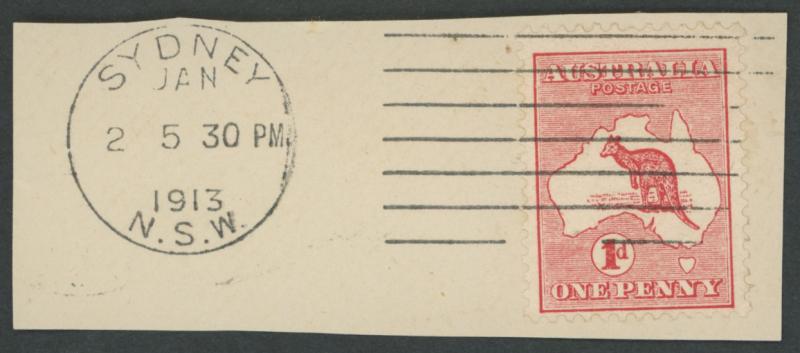 1913 1d Kangaroo Die I on-piece tied by very fine 'SYDNEY/JAN/2 5 30PM/1913/N.S.W.' machine cancel, Cat $15,000 for a cover. Chris