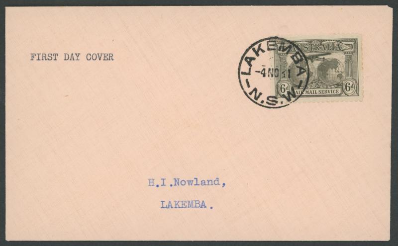 1931-38 6d Airmail Service ACSC 144y tied to typed 'First Day Cover' by neat 'LAKEMBA/4NO31/N.S.W.' cds, Cat $850. (Image1) (Image2)
