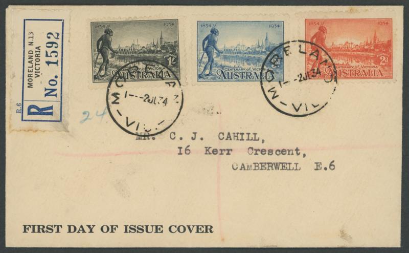 1934 Centenary of Victoria 2d 3d & 1/- ACSC 153y tied to Orlo Smith FDC by two 'MORELAND/2JU34/VIC' cds, to Camberwell with blue &