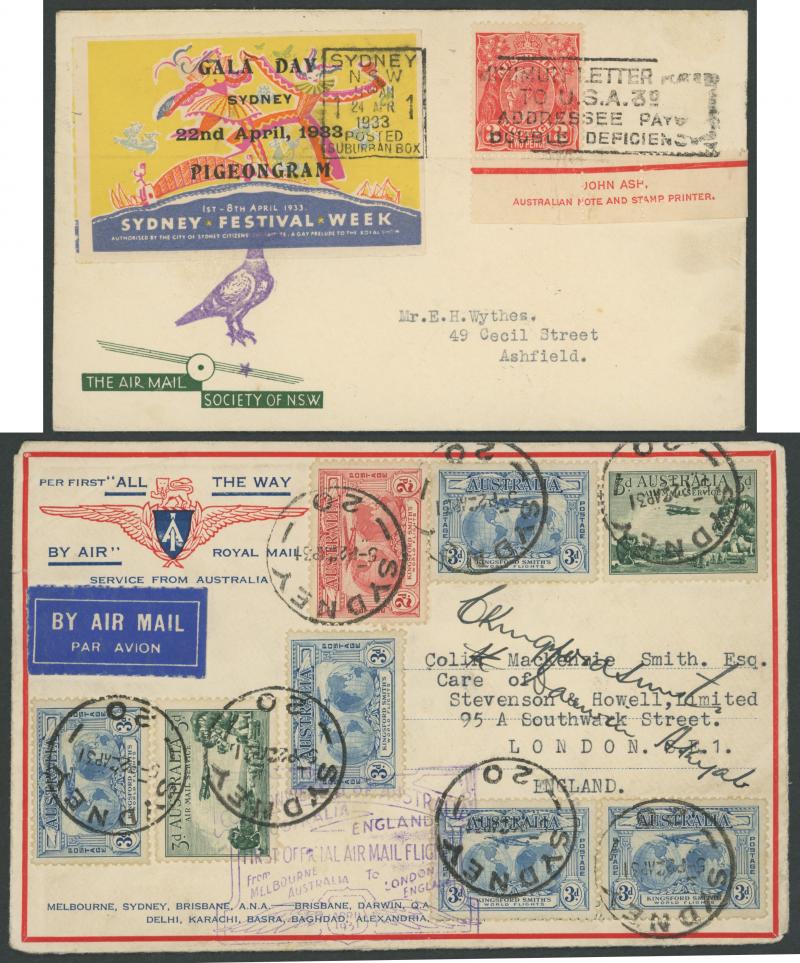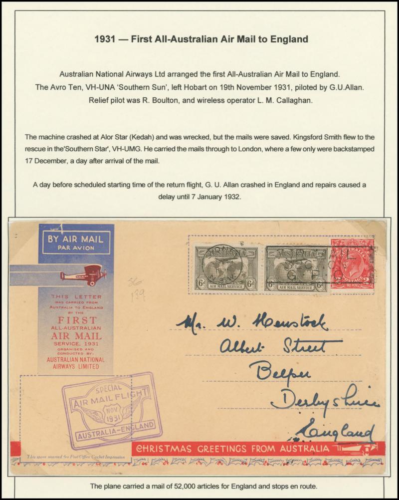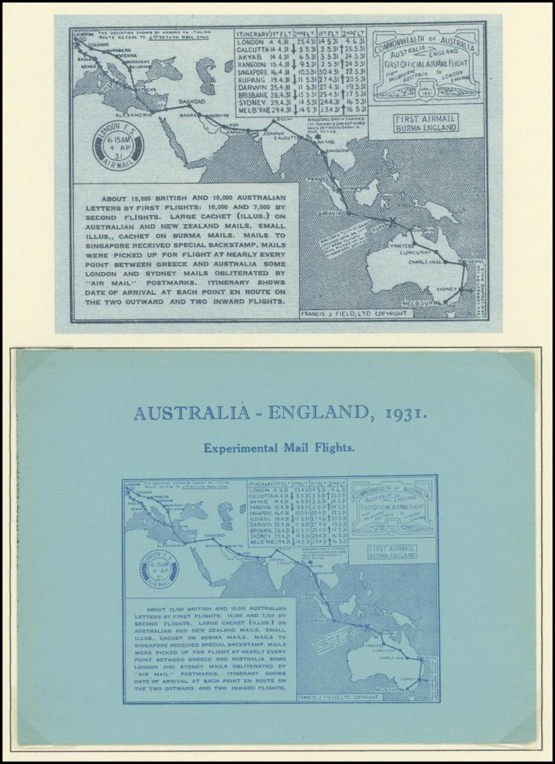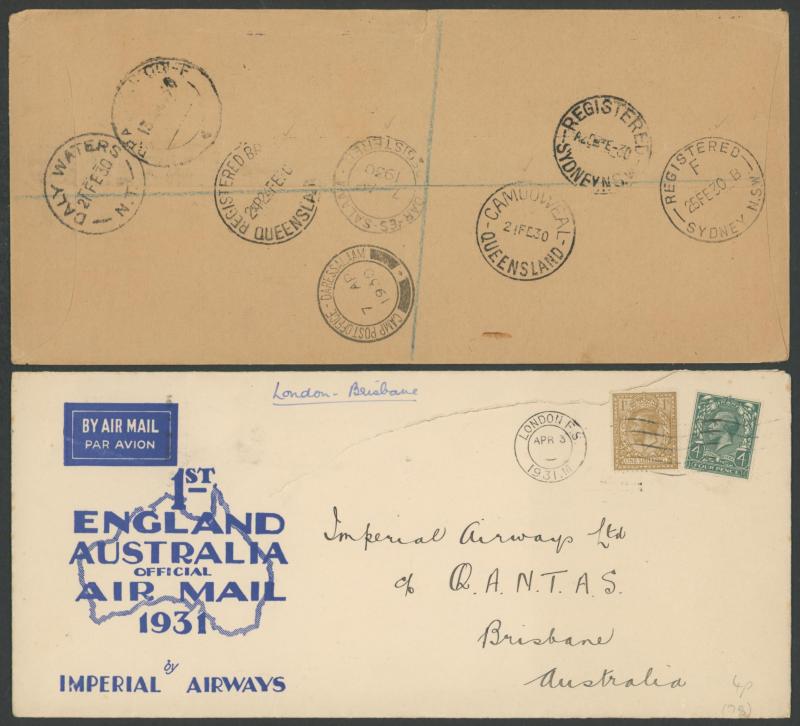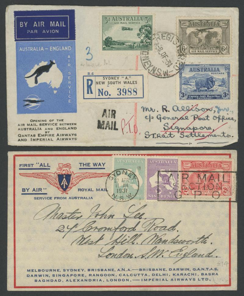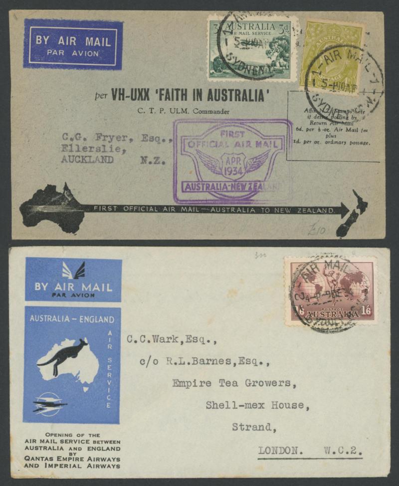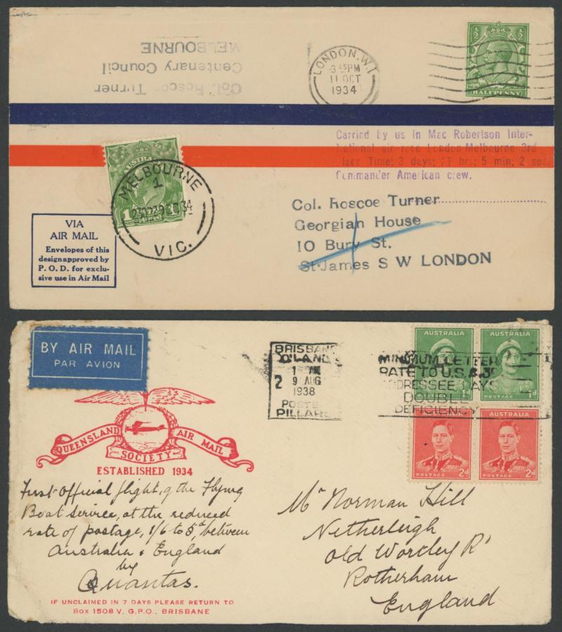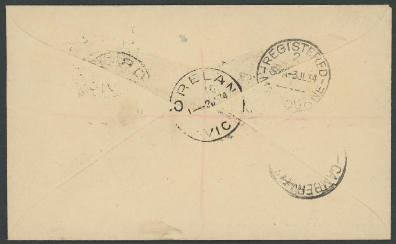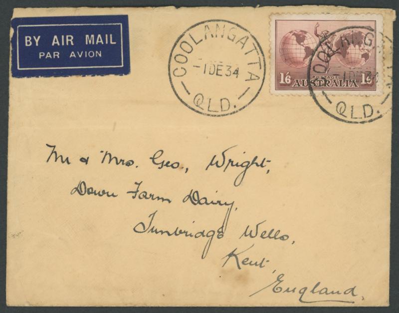 light folds clear of the stamp, Cat $575. Held at Brisbane to be carried on the inaugural air service to England, departing Brisbane 8.8.1934.
