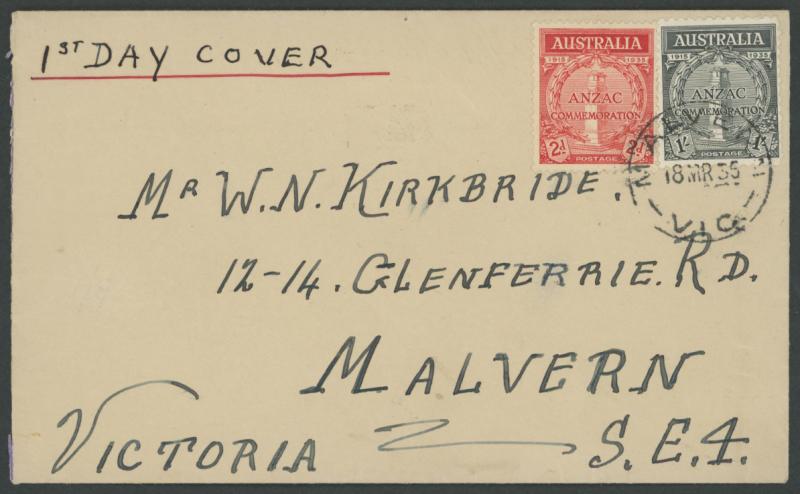 1935 Anzac Anniversary 2d & 1/- ACSC 165y on hand endorsed cover to Malvern, Vic, tied by 'MALVERN/18MR35/VIC' cds, back with