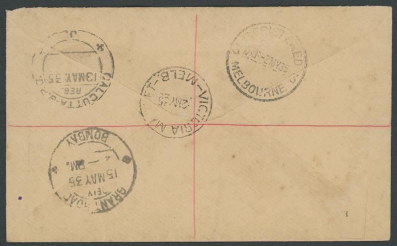 1935 Silver Jubilee 2d 3d & 2/- ACSC 168y tied by 'VICTORIA MARKET/2MY35/VIC' cds to registered airmail cover to India, 'GRANT ROAD