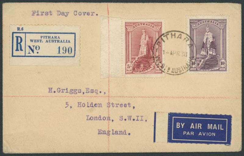1938-49 Coronation Robes Thick Paper 5/- & 10/- ACSC 212y & 214y tied by 'PITHARA/1APR38/WESTN AUSTRALIA' cds to plain envelope