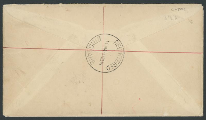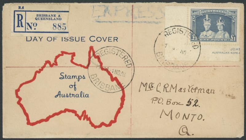 Smythe cover by 'REGISTERED/1NO38/BRISBANE' cds, with blue/white R label, and manuscript 'EXPRESS' in blue pencil at top, Cat $4250. A rare First Day Cover. (Image1) (Image2)