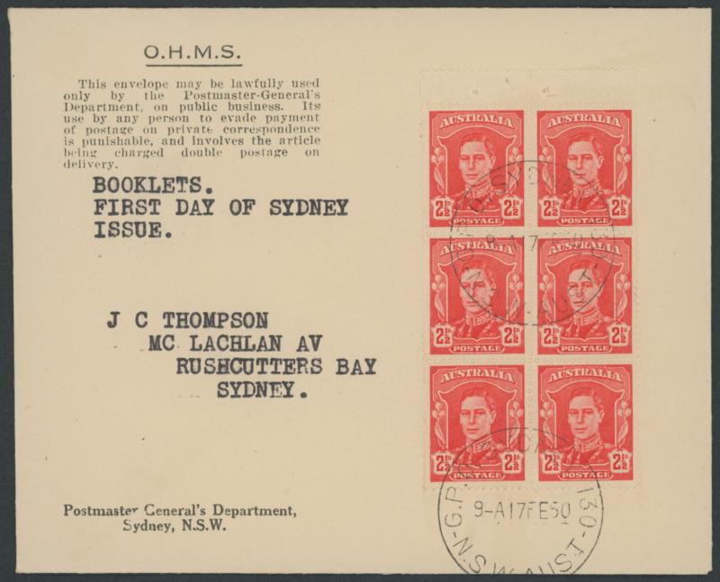 1942-50 2½d KGVI booklet pane of six ACSC 230ya on Thompson cover tied by 'G.P.O. SYDNEY 130/17FE50/N.S.W. AUST' cds, ACSC states
