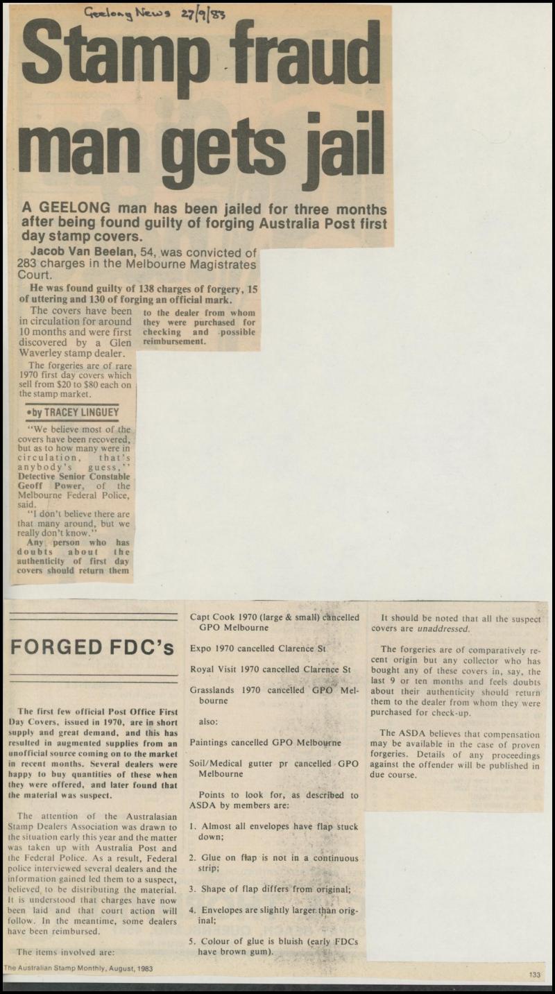 1970 Grasslands Congress forgery (as ACSC 521y) with 'CLARENCE ST. SYDNEY' cds, plus four 1983 Geelong Advertiser articles relating