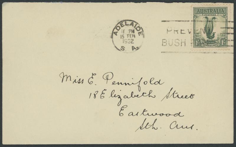 1932 1/- Lyrebird tied by 'ADELAIDE/15FEB/1932/S.A.' machine cancel to plain locally addressed cover ACSC 145y, Cat $450. (Image1) (Image2)