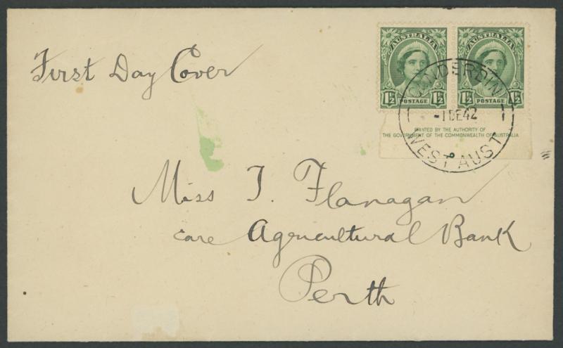 1942-50 Definitives Incorporating War Tax QE 1½d green SG 204 Authority Imprint pair tied by 'CUNDERDIN/-1DE42/WEST AUST' cds to