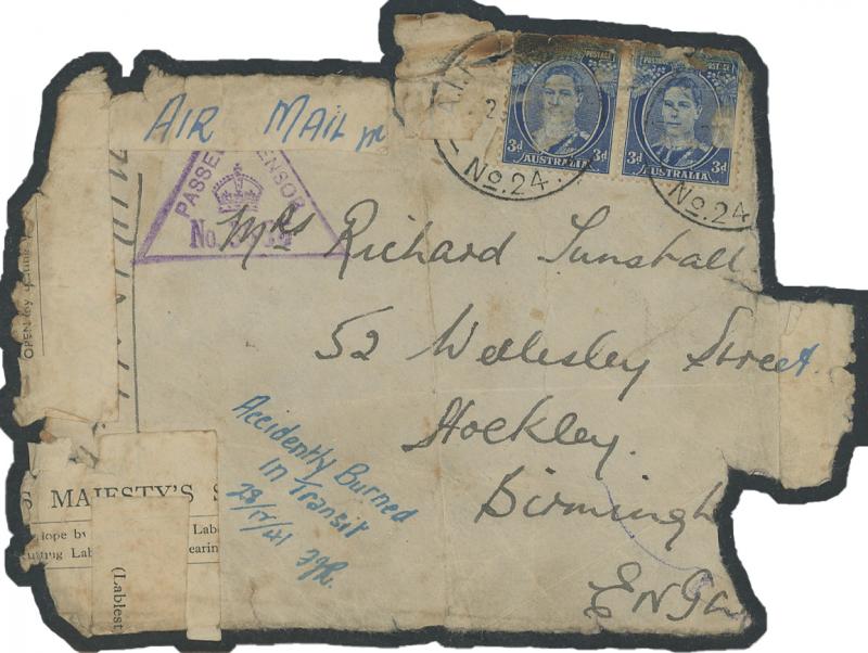 1941 (Dec) large-part distressed airmail cover-front to England with KGVI 3d x2 - singed, a third missing - tied by 'AIF FIELD