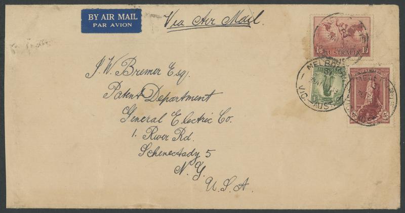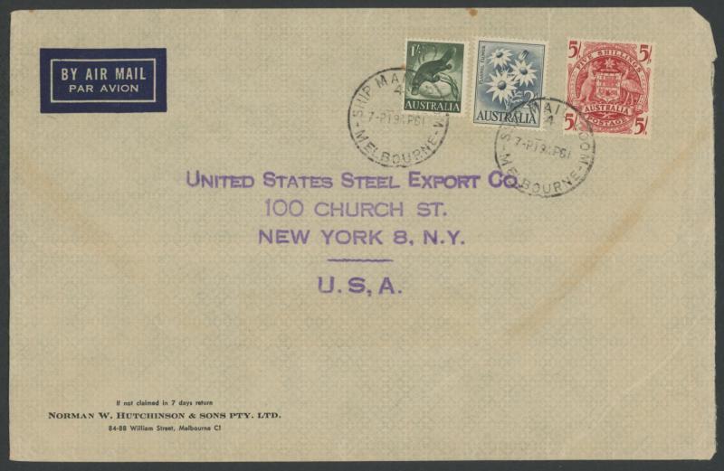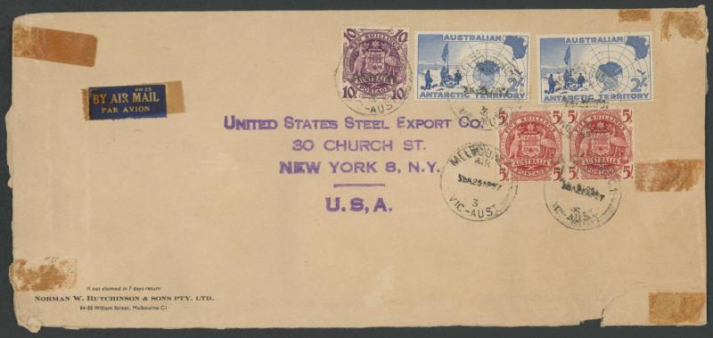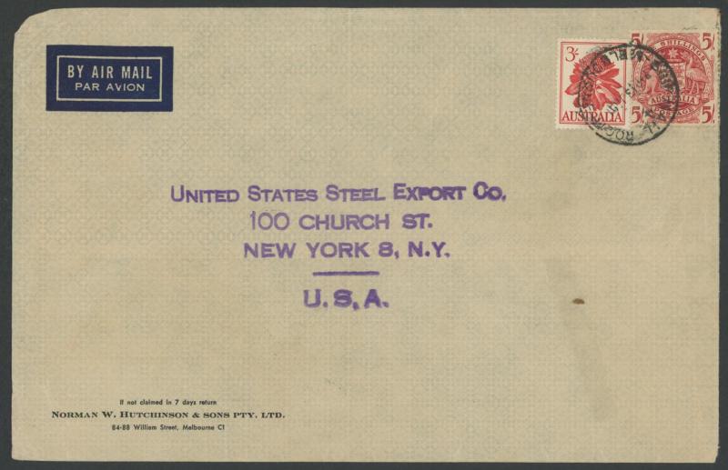 1949 (Feb 14; Valentine's Day) quintuple-rate airmail to New York with Lyrebird 1/-, Hermes 1/6d lake & Robes Thin Paper 5/- tied