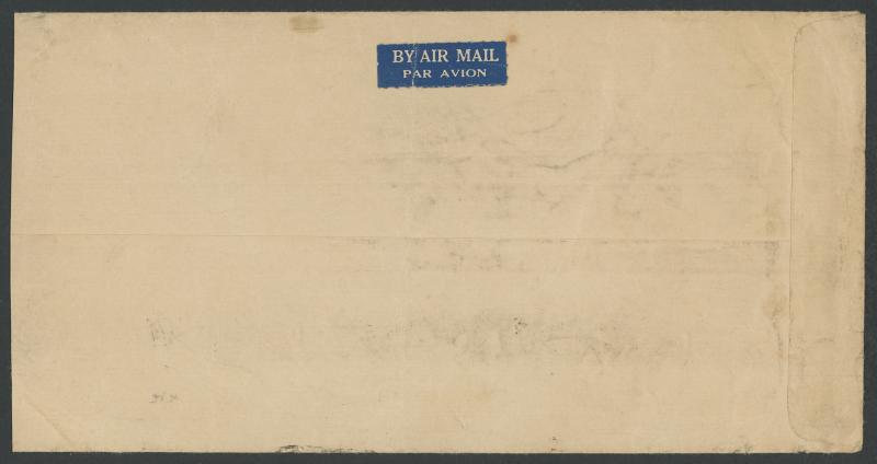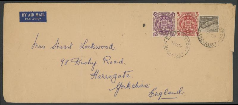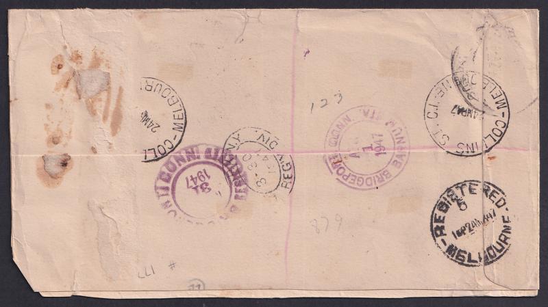 10c tied by smudged cancel, opened-out for display & the flap removed. Between mid-1946 & 31.5.1947 the rate was 2/6d per ½oz x4 plus 3d registration. (Image1) (Image2)