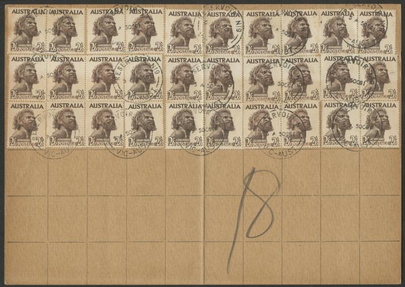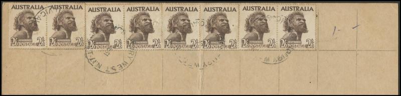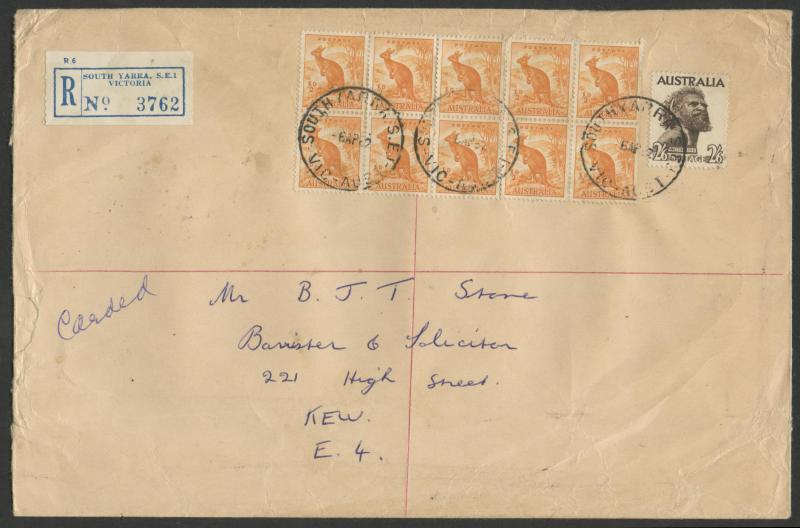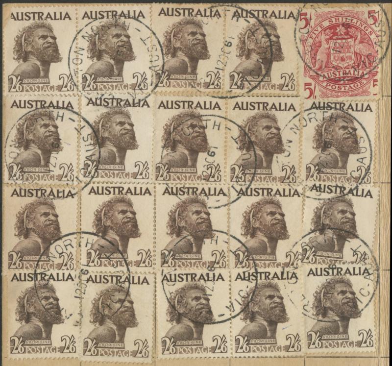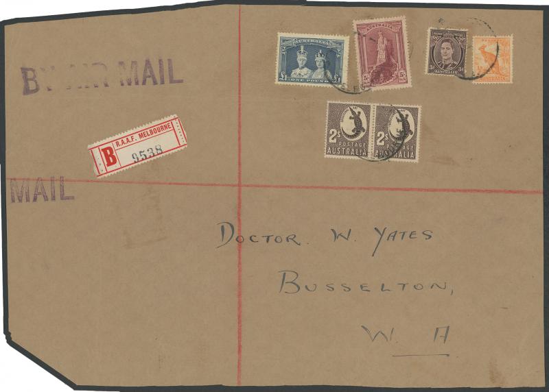 purple-brown, Aboriginal Art 2/- chocolate pair, Robes Thick Paper £1 & Thin Paper 5/- on Tinted Paper tied by poor GPO Melbourne cds, scarce red & black/white 'B RAAF MELBOURNE' R label, unfolded & remarkably fine for such an item.