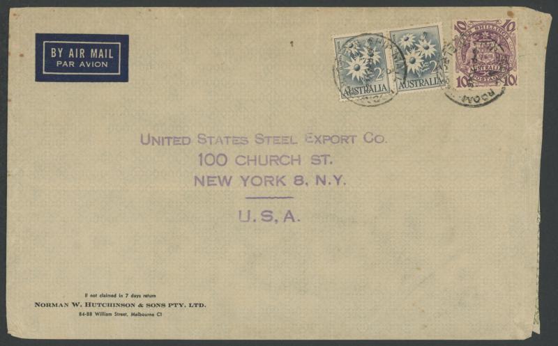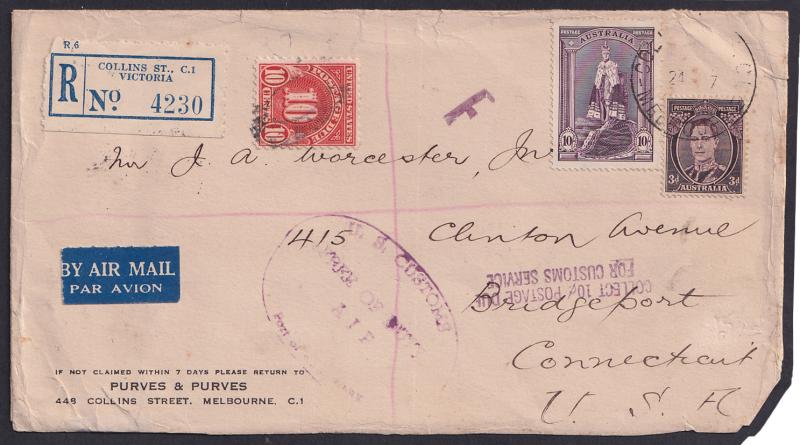by 'COLLINS ST/MELBOURNE' cds, New York transit & 'BRIDGEPORT, CONN/APR/1/1947/ BARNUM STA' arrival backstamp in purple, on the face Customs '.../FREE OF DUTY/...' & very fine 'COLLECT 10c POSTAGE DUE/FOR CUSTOMS SERVICE' both in purple, Postage Due