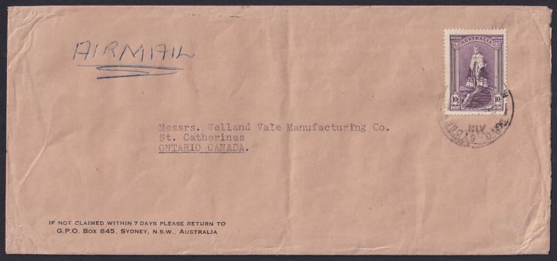 1947 (circa) to Ontario with scarce solo franking of Robes Thick Paper 10/- (Cat $800) tied by poor Sydney cds, light central fold