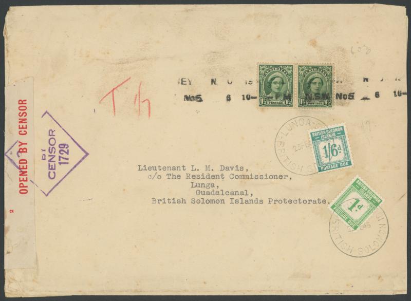 Solomon Islands Protectorate" with QE 1½d x2 tied by parcel-roller cancel, manuscript "1/7" in red, Solomons Postage Dues 1d & 1/6d (Cat £62 x5+ on cover) tied by fine Australian-pattern 'LUNGA/23FE45/...' cds, minor blemishes. The rate was 2d per