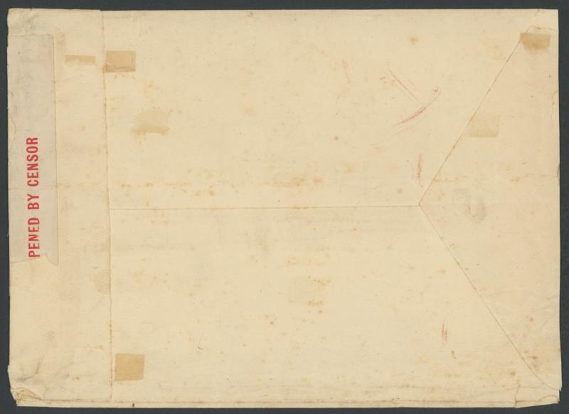 slightly trimmed at left not affecting the adhesives. The package almost certainly contained a gold sample, which was required to be sent at the letter rate of 2d per ounce x148 + 3d registration + ½d War Tax = £1/4/11½d with a ½d convenience