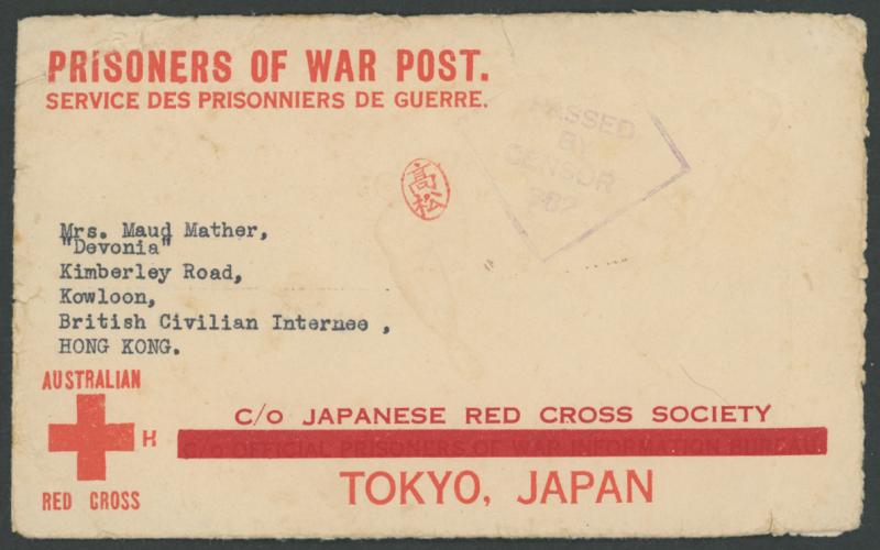 1943 (circa) Australian Red Cross envelope with Thick Obliterating Bar at the Base to a British Civilian Internee in Hong Kong with