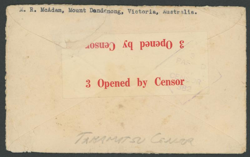 censored with Sydney resealing label and cachet at left but very fine 'NOT TRANSMISSIBLE/SERVICE SUSPENDED' large two-line handstamp struck on the face in violet and 'Fickle Finger' cachets in red front & back, the return address typed on the reverse