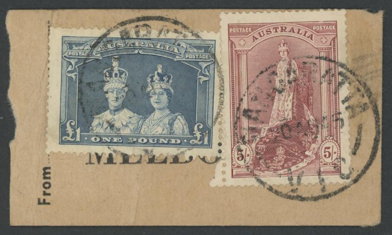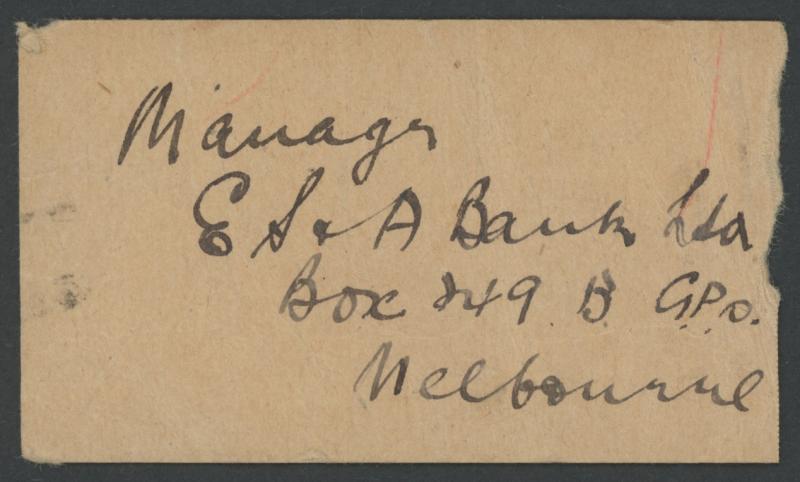 1945 (Aug 20) tiny parcel tag to the ES&A Bank in Melbourne with Robes Thick Paper 5/- lake & £1 blue tied by 'WANGARATTA/VIC' cds,