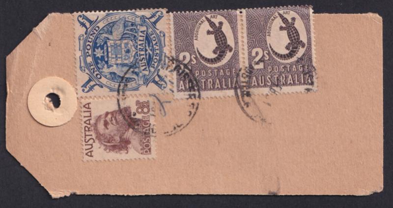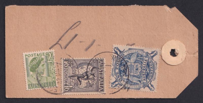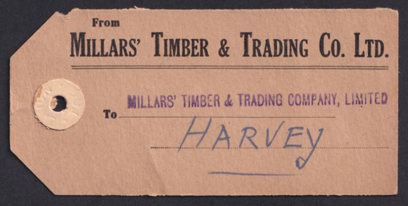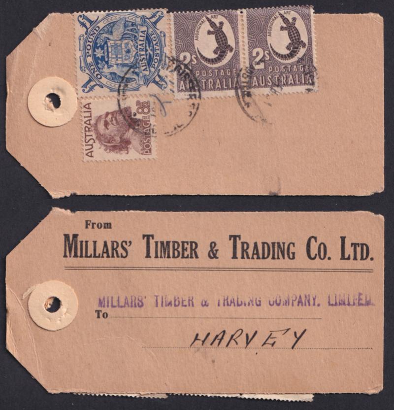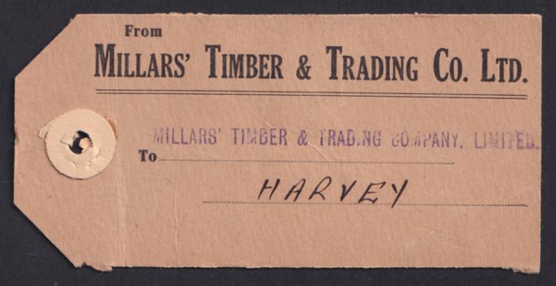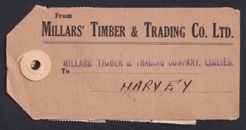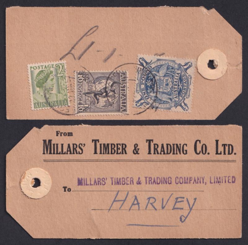 1951 (circa) Millars' Timber & Trading Co Ltd parcel tag to the firm's branch in Harvey (WA) with Arms £1 blue (ACSC $350 on cover)