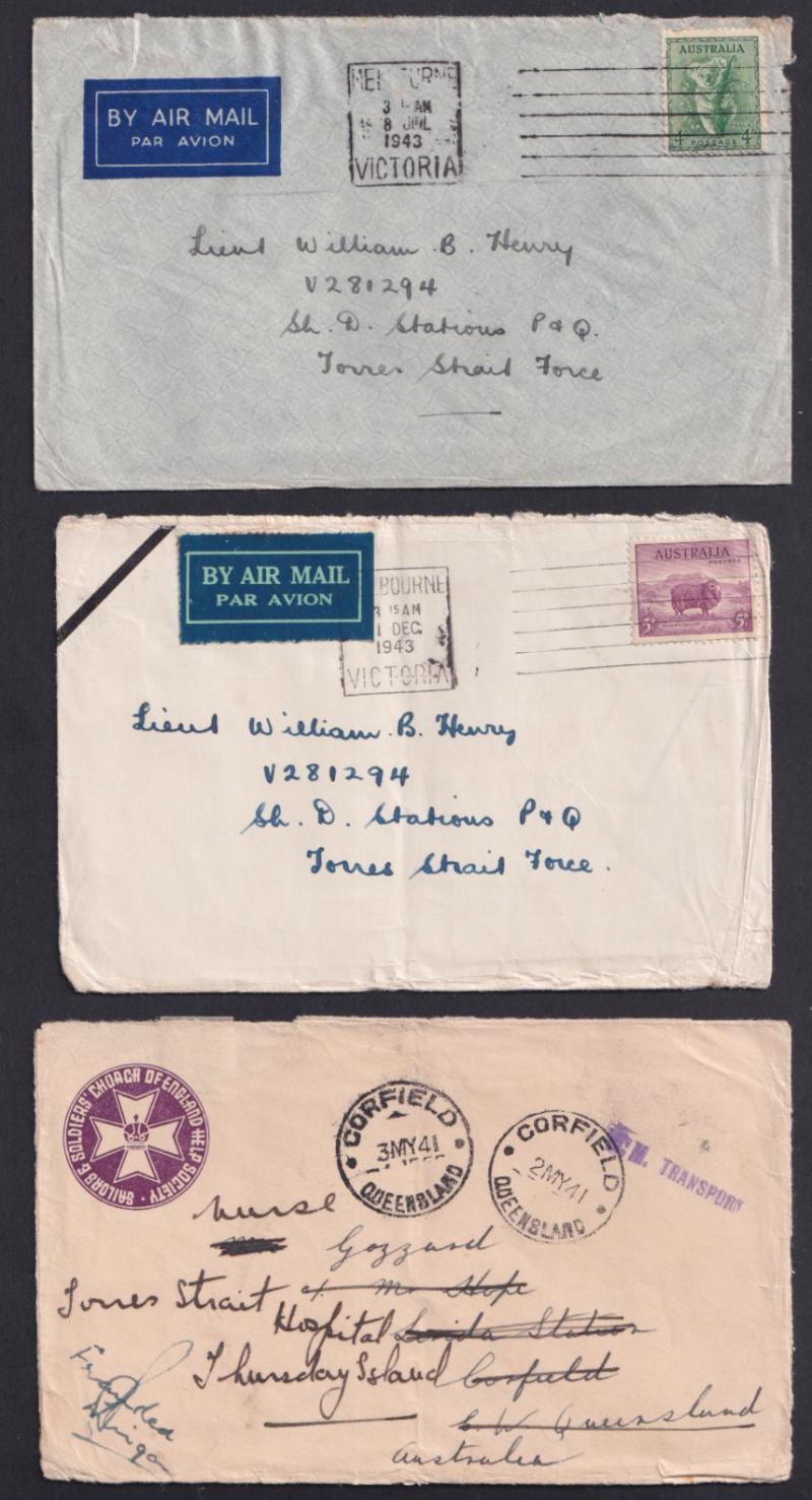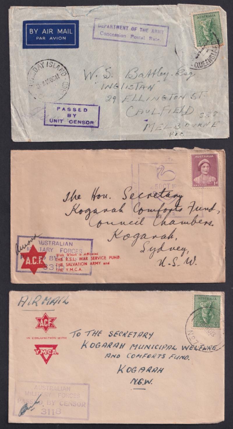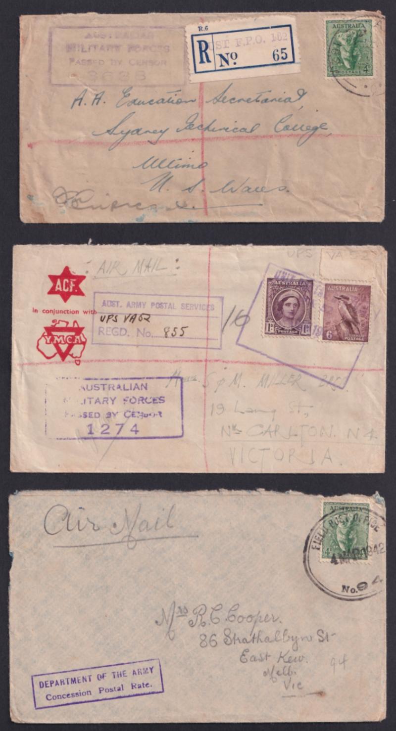 (one with 'AUST FPO 162' cachet on blank R label) and from UPS 'V 52' both used at Higgins Field air base, also Official Mail, Comfort Fund envelopes, civilian censorship, a few inwards items one OHMS registered to "Movement Control, Thursday Island"