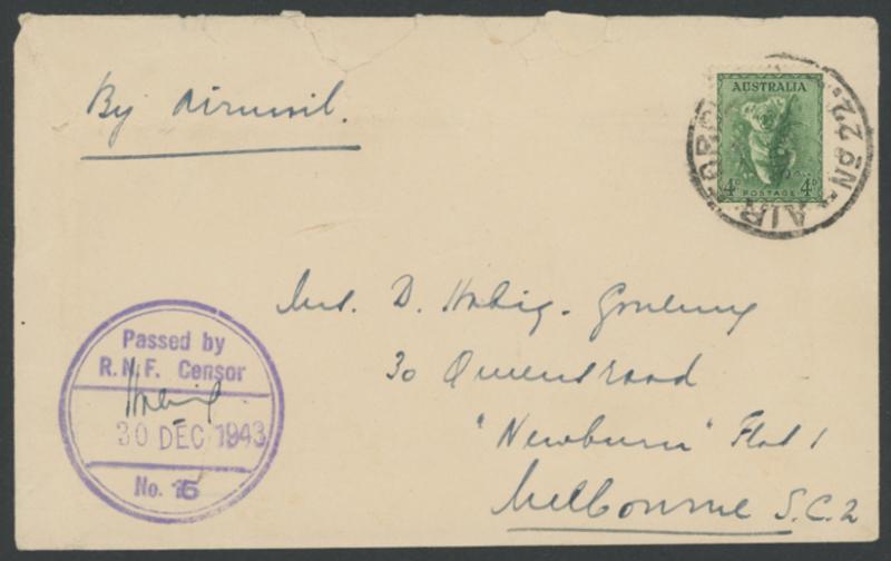 1943 (Dec 30) Dutch Forces in the Northern Territory to Melbourne with 4d Koala tied by 'AIR FORCE P.O./No.22' cds used at