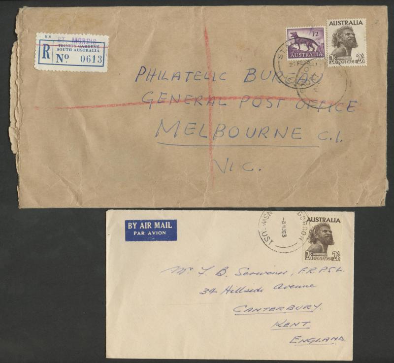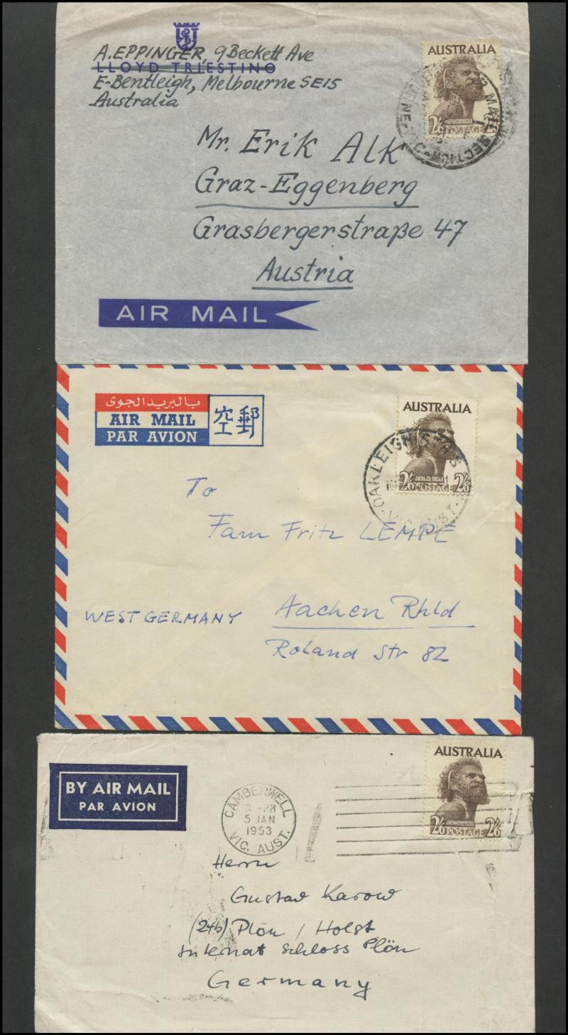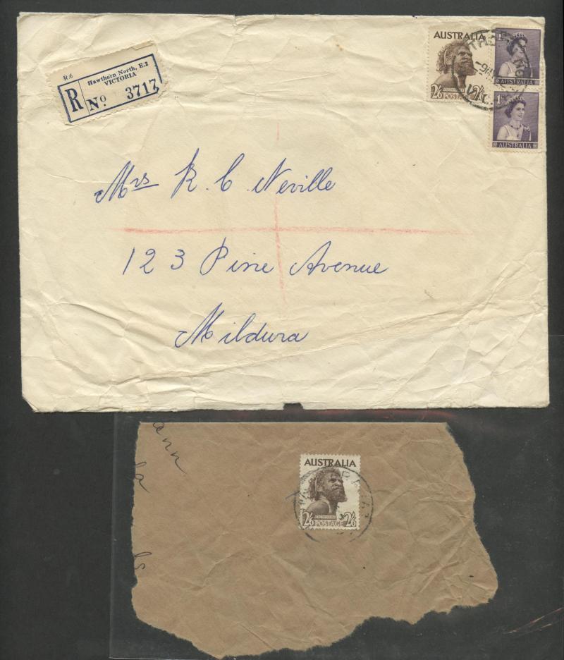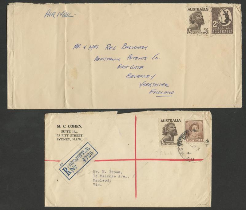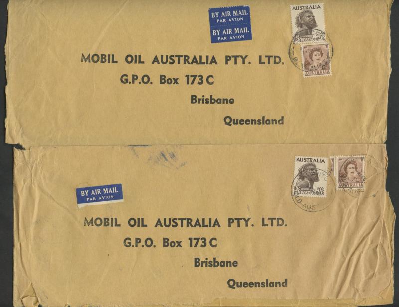 1952-65 2/6d Aborigine usages including solo frankings on Mobil Oil oversized envelope domestic airmail to Brisbane and to Austria
