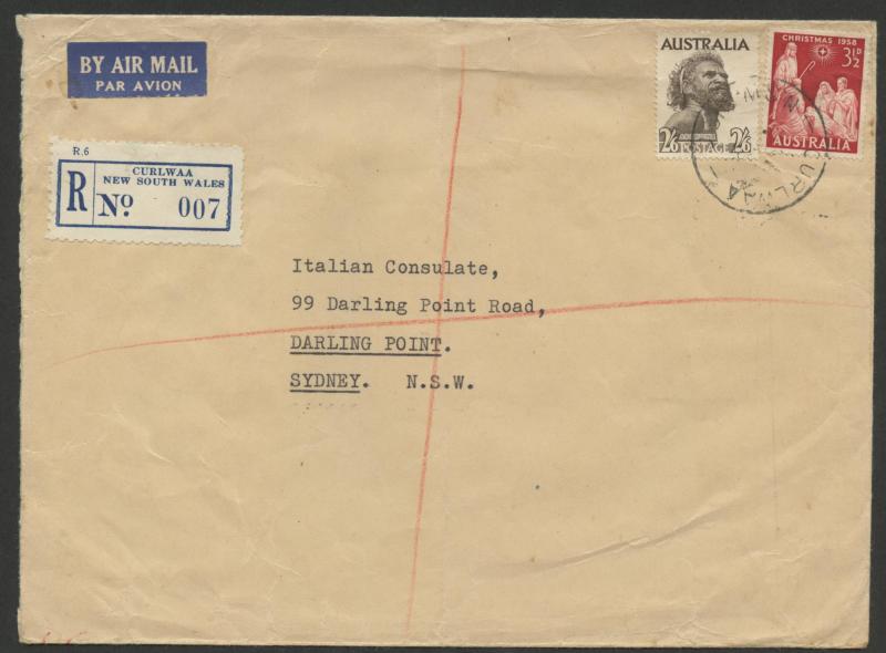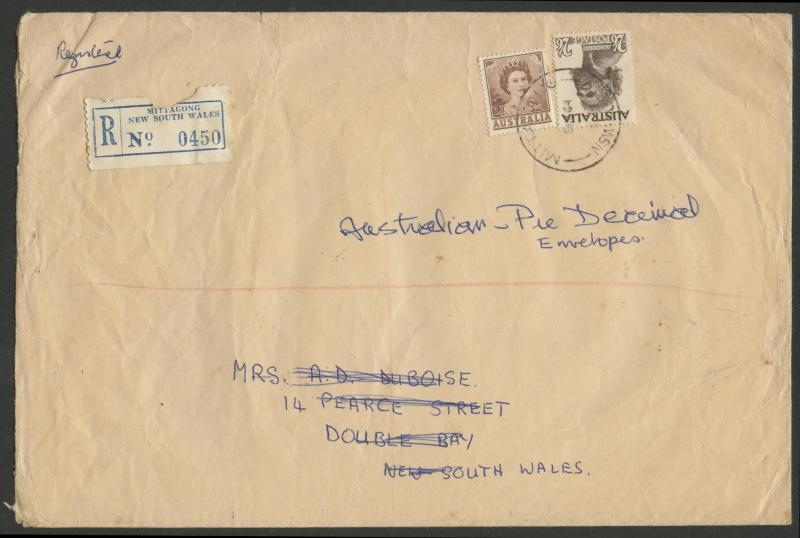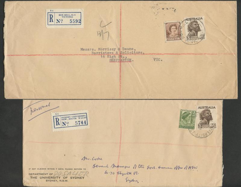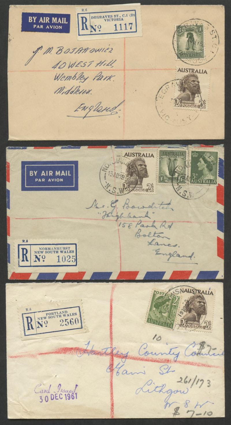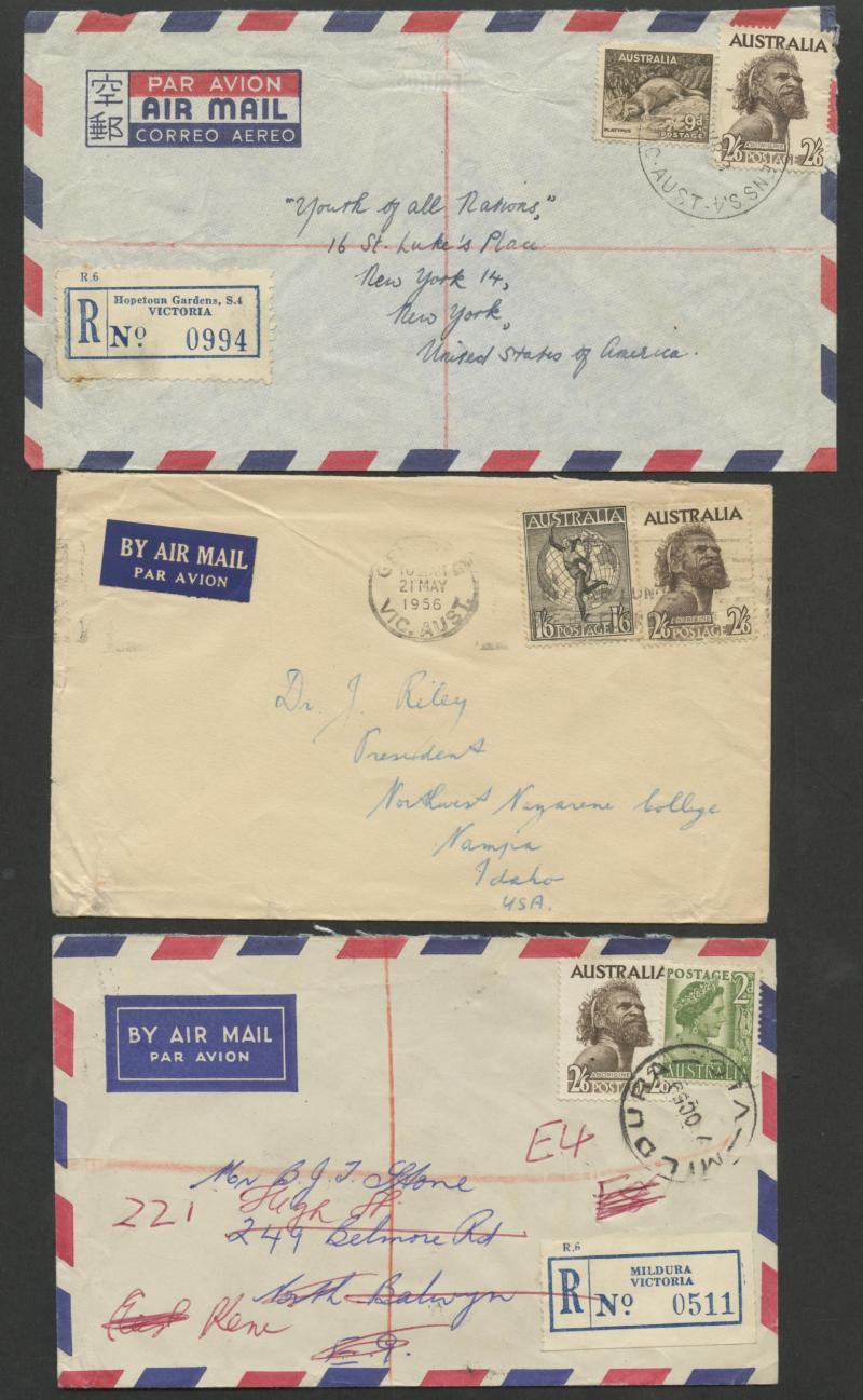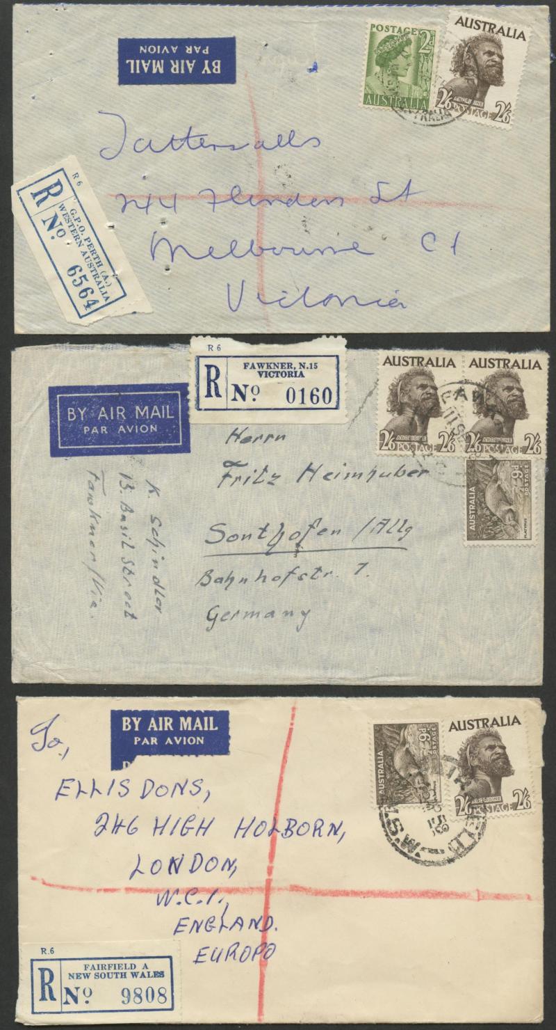 & Germany x2 over-paying the 2/3d airmail rate, 1956 with QEII 3d green airmail registered to Canada, 1958 with 9d Platypus registered airmails to England & USA and to Germany with a pair plus 9d Platypus, 1959 with 1/- Lyrebird registered airmail to