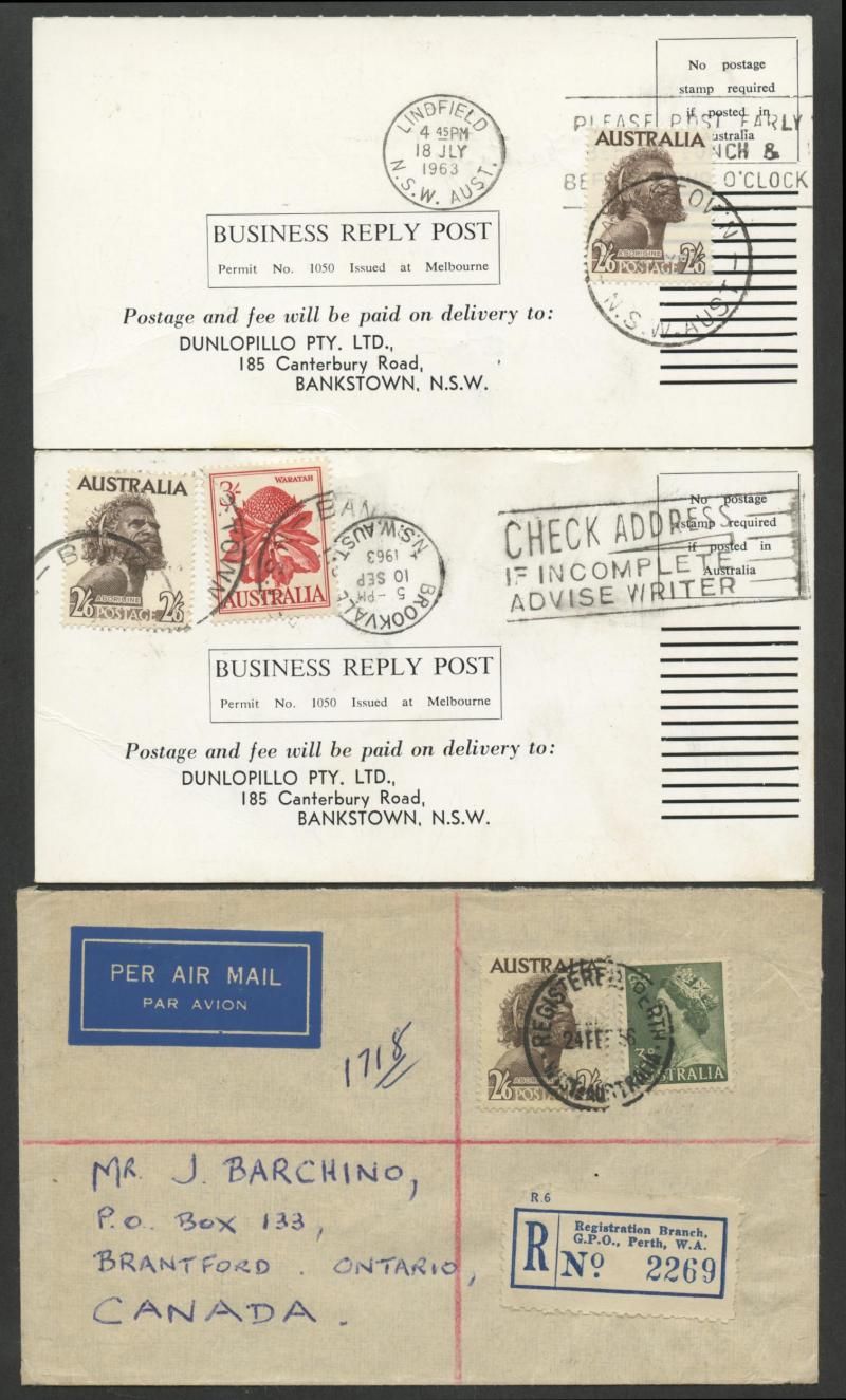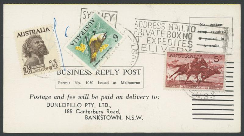 1964 (Aug 22) Dunlopillo business reply postcard returned with Sydney machine cancel and Birds 6d Thornbill, 2/6d Aborigine &