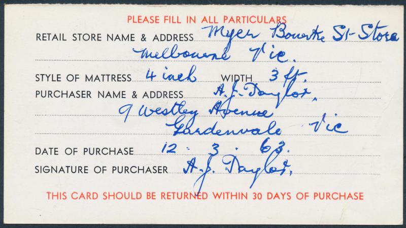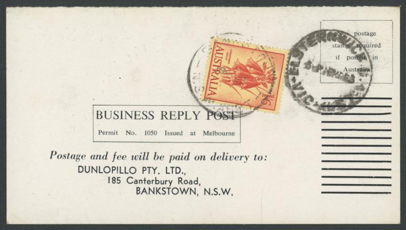 1963 (March 19) Dunlopillo business reply postcard returned with Elsternwick (Vic) cds cancel and Flowers 1/6d Christmas Bells