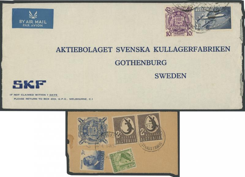airmail to India and with 1/- Lyrebird on a complete parcel wrapper airmail to USA, on Broadcast Listener's Licence Fee cards x2, also 10/- on complete airmail parcel tags x2 different, with 2/- QANTAS on SKF envelope airmail to Sweden, with 6d