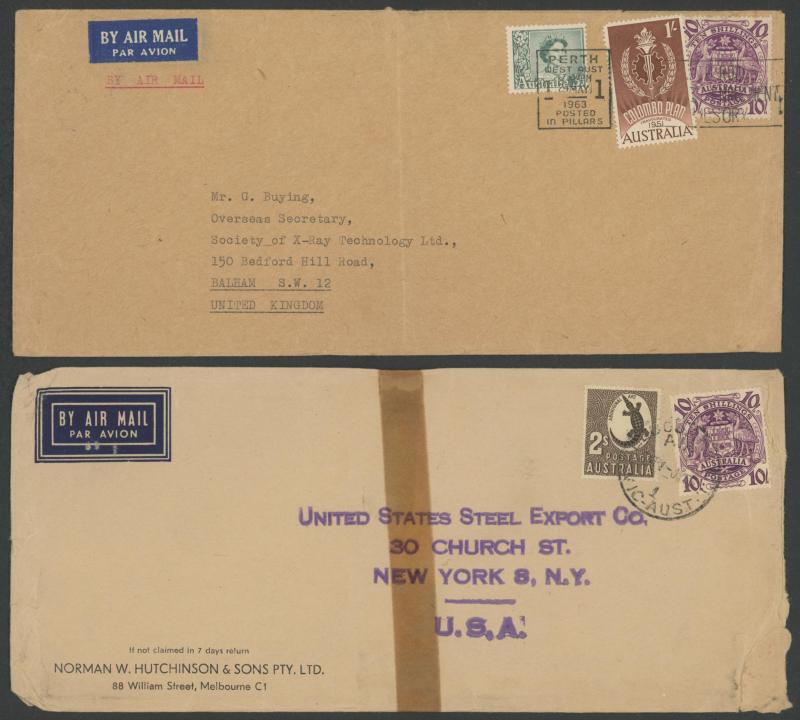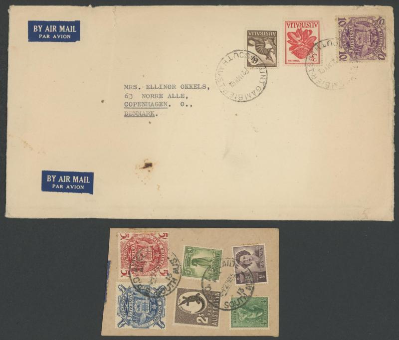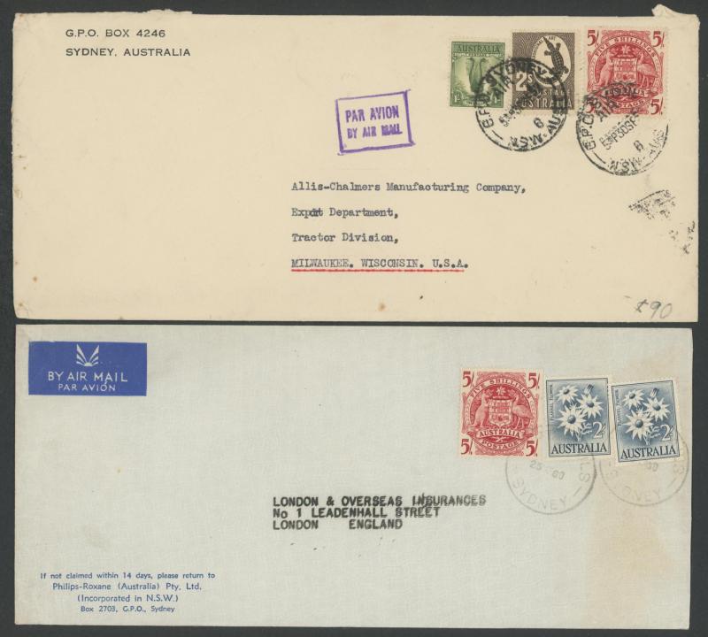 Anteater & 3/- Flower airmail to Denmark, with QEII 3d green & 1/- Colombo airmail to UK, with 5/- Arms & 9d Platypus airmail to England, and with various combinations to USA x3, plus £1 on Millars Timber (WA) parcel tag and another £1 with 5/- on