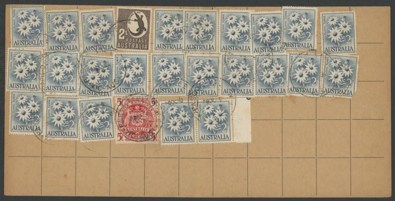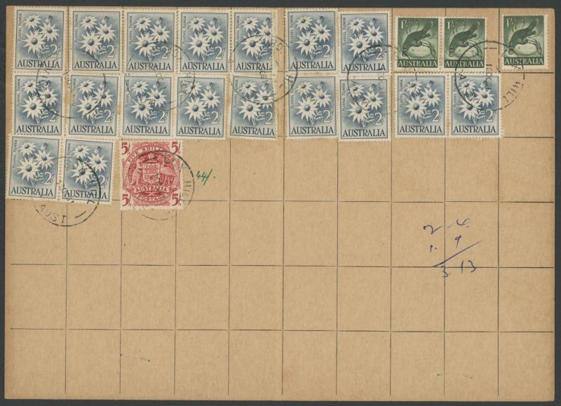 Cattle Industry 5/- White Paper (ACSC #373C; Cat $400 on-cover) afffixed in lieu of Postage Dues tied Bankstown (NSW) cds paying postage on 16 similar articles at 6d each (5d postcard rate plus 1d reply mail fee), very fine. Scarce usage. (Image1) (Image2)