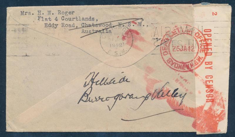 presumably incorrect as crossed out and opened with 'DEAD LETTER OFFICE/26JA42/SYDNEY NSW' double-ring cds on reverse, a couple of minor transmission marks. Upon news of the Japanese attack on Pearl Harbour, all outgoing mail was held; by January