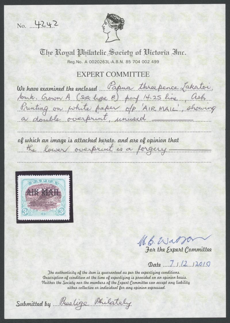 (2010) states "the lower overprint is a forgery". Sold at our auction of 25.3.2011 for $303 (Sale 163 Lot 452).